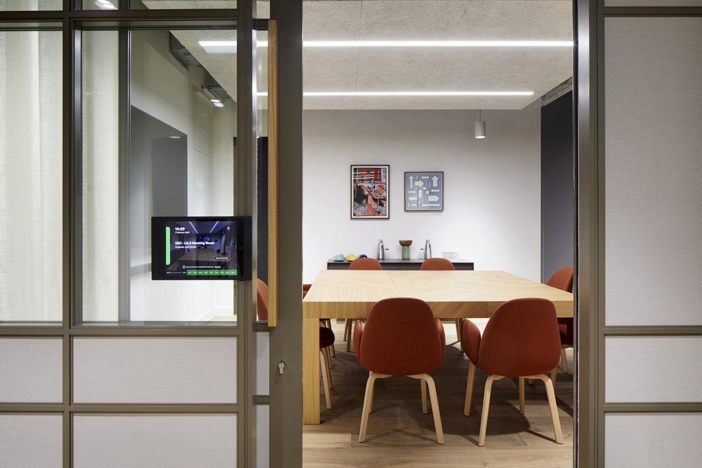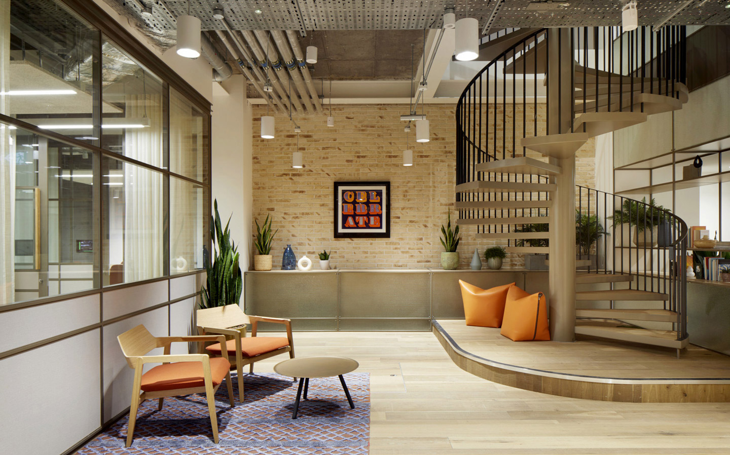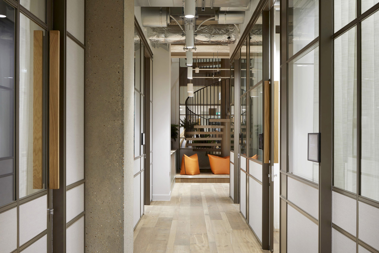 Le pareti divisorie degli ambienti di lavoro richiamano lo stile delle antiche tradizioni del Regno Unito, in cui le superfici finestrate e i bow window erano caratterizzati da un telaio che divideva le vetrate in riquadri geometrici.