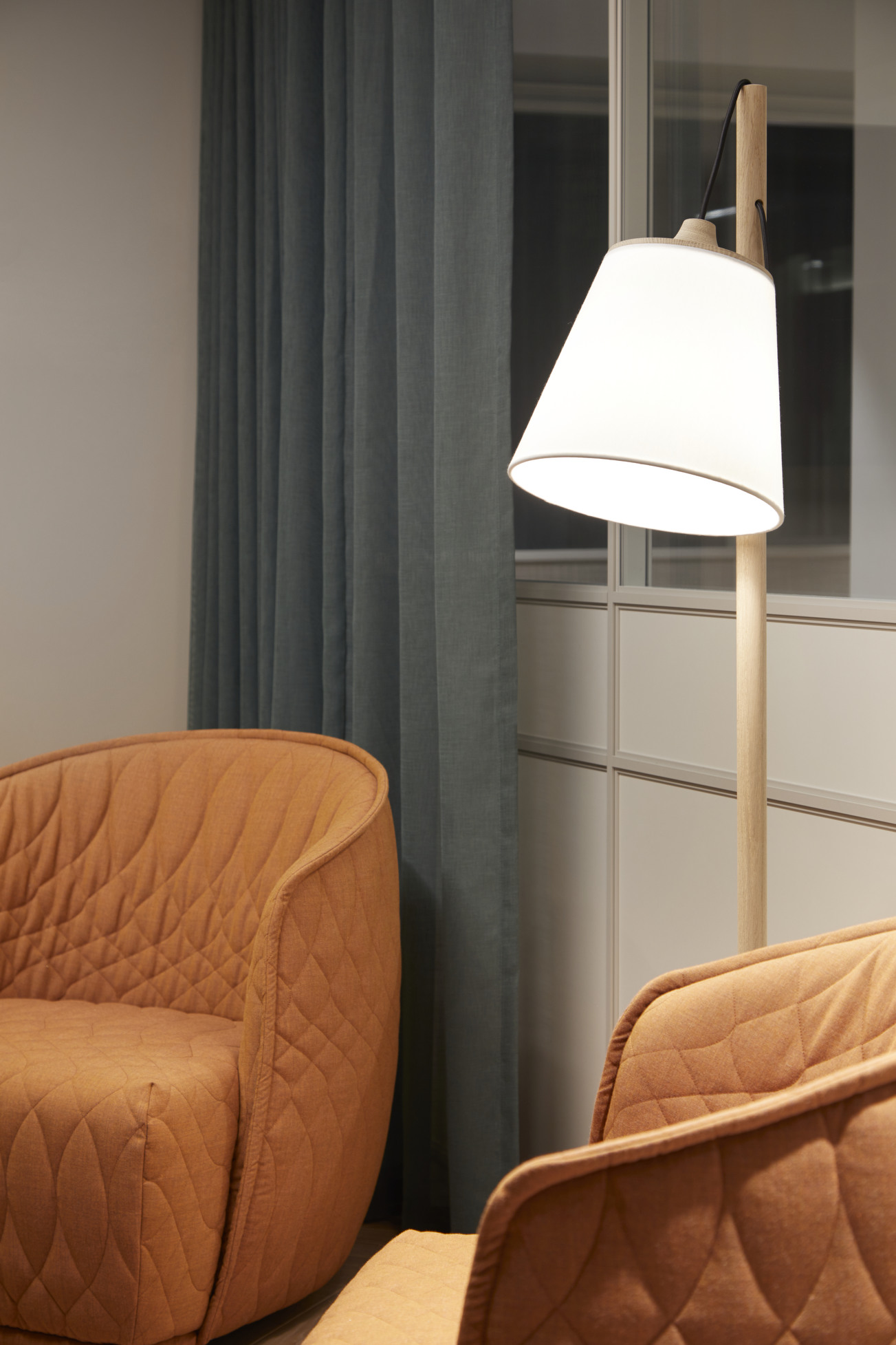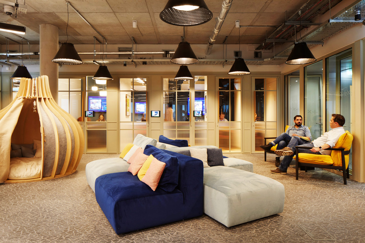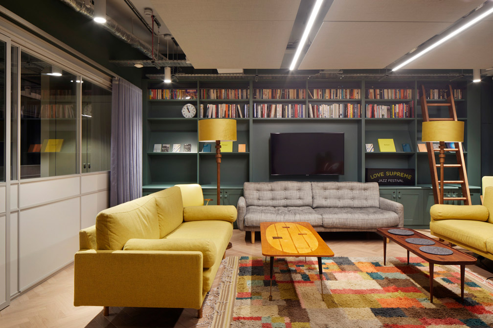 Le pareti divisorie degli ambienti di lavoro richiamano lo stile delle antiche tradizioni del Regno Unito, in cui le superfici finestrate e i bow window erano caratterizzati da un telaio che divideva le vetrate in riquadri geometrici.