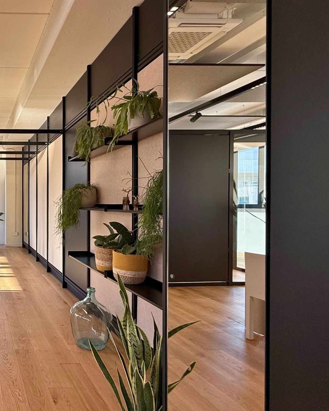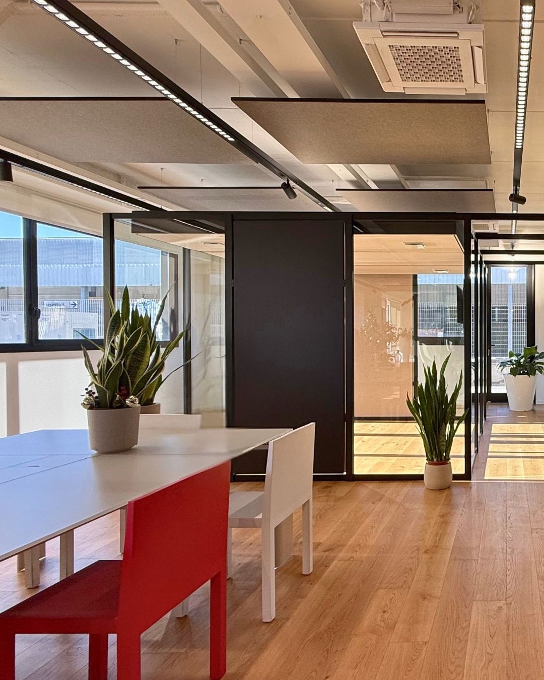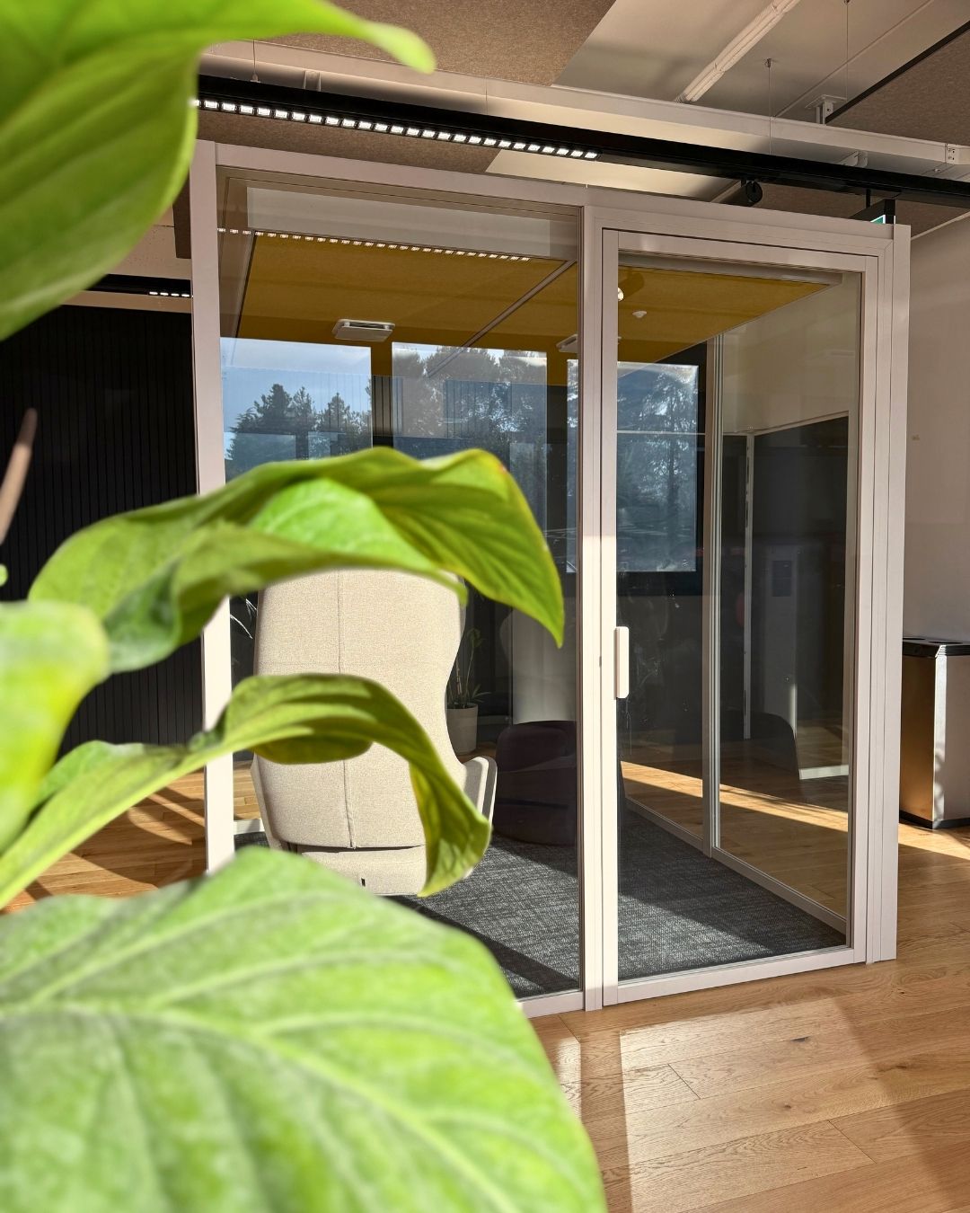 A questo si aggiungono tende acustiche lungo le pareti vetrate, che riducono il rumore di fondo e controllano la privacy visiva. L’utente personalizza in base all’uso: chiamata riservata, brainstorming, concentrazione individuale.