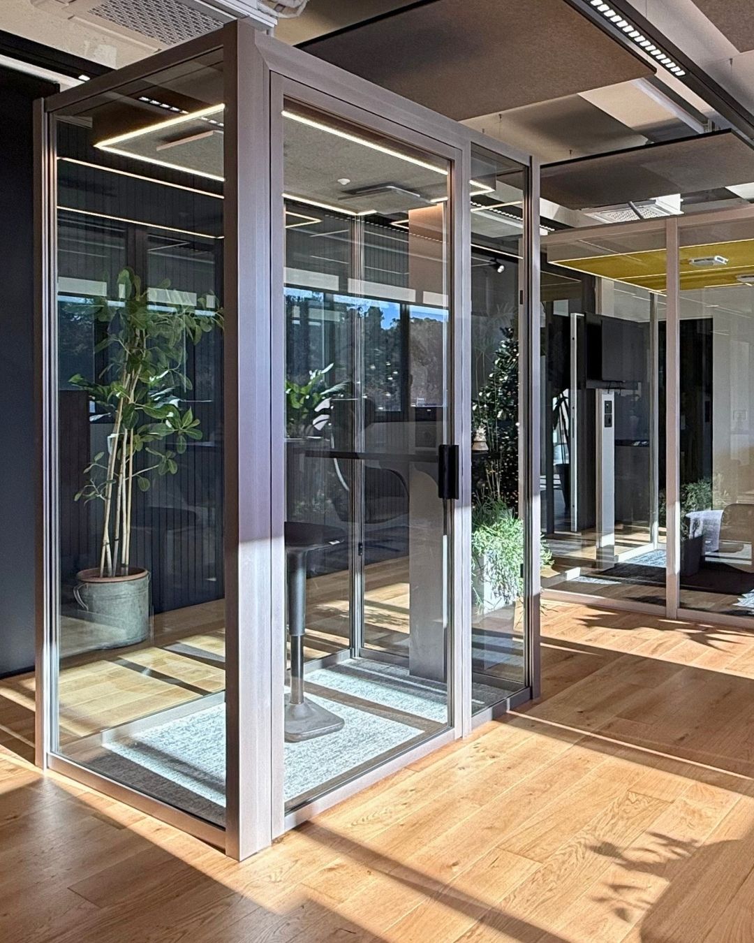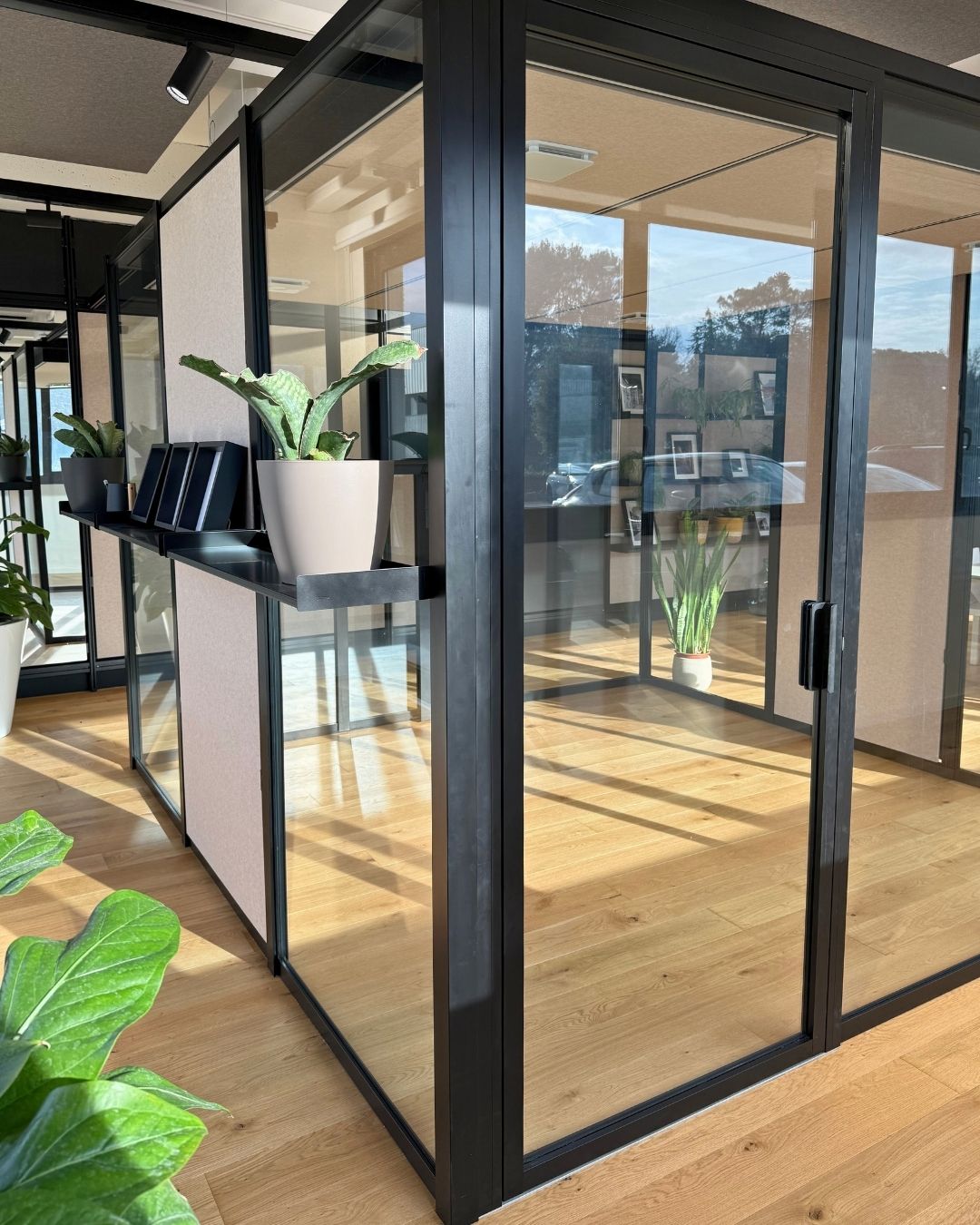 I profili in alluminio sono calibrati per ridurre l’ingombro visivo: sezioni sottili, giunti a filo, linea di bordo continua. Il box si integra senza imporsi. Nelle versioni con pareti scrivibili, il vetro diventa lavagna per schemi rapidi o diagrammi di processo. La cabina si trasforma in strumento operativo, non solo in rifugio.