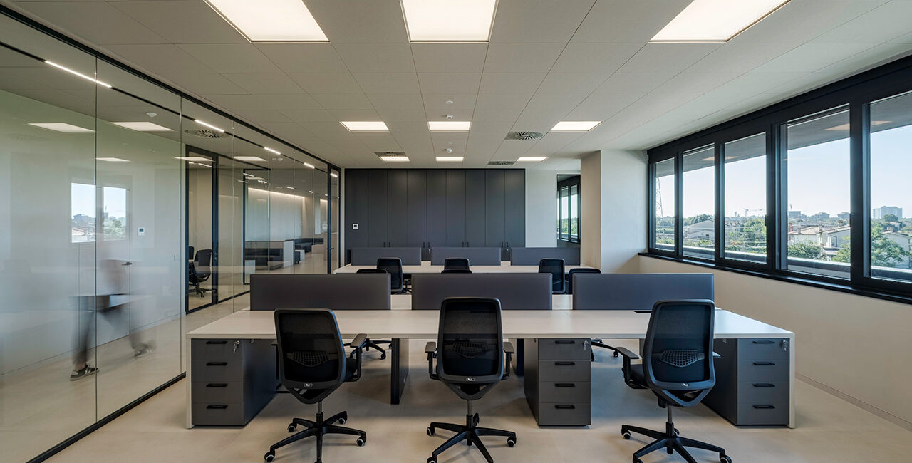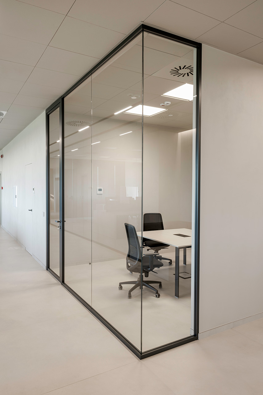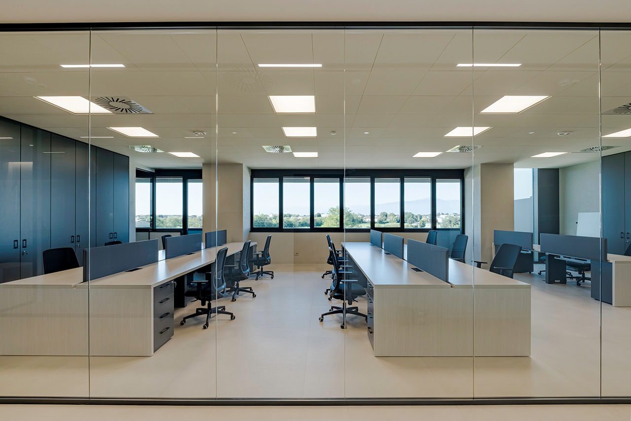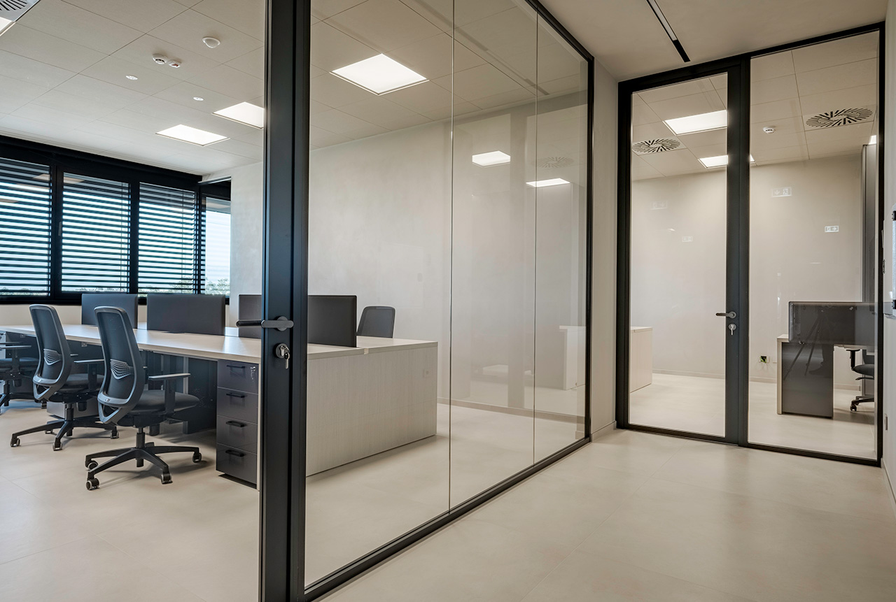 Le pareti divisorie organizzano lo spazio con precisione, accompagnando la luce e costruendo ambienti distinti ma connessi. Le superfici vetrate mantengono trasparenza e profondità, mentre le soluzioni adottate contribuiscono a un controllo acustico efficace, migliorando la qualità degli ambienti operativi.