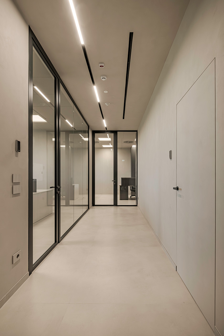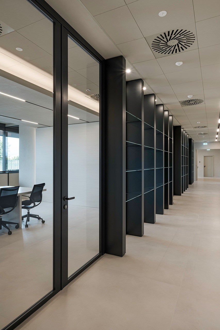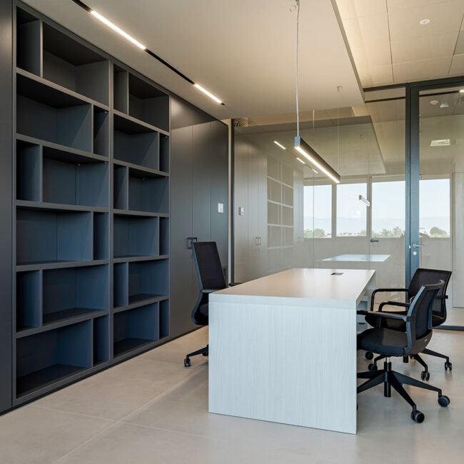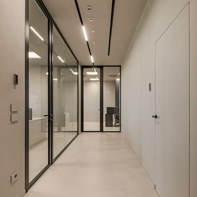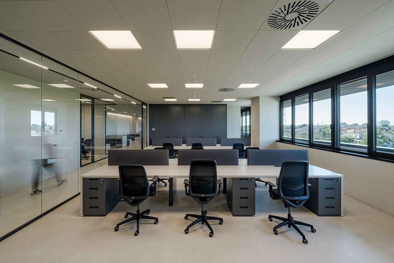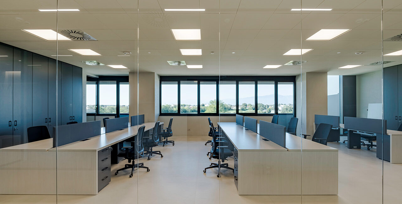 Le pareti divisorie organizzano lo spazio con precisione, accompagnando la luce e costruendo ambienti distinti ma connessi. Le superfici vetrate mantengono trasparenza e profondità, mentre le soluzioni adottate contribuiscono a un controllo acustico efficace, migliorando la qualità degli ambienti operativi.