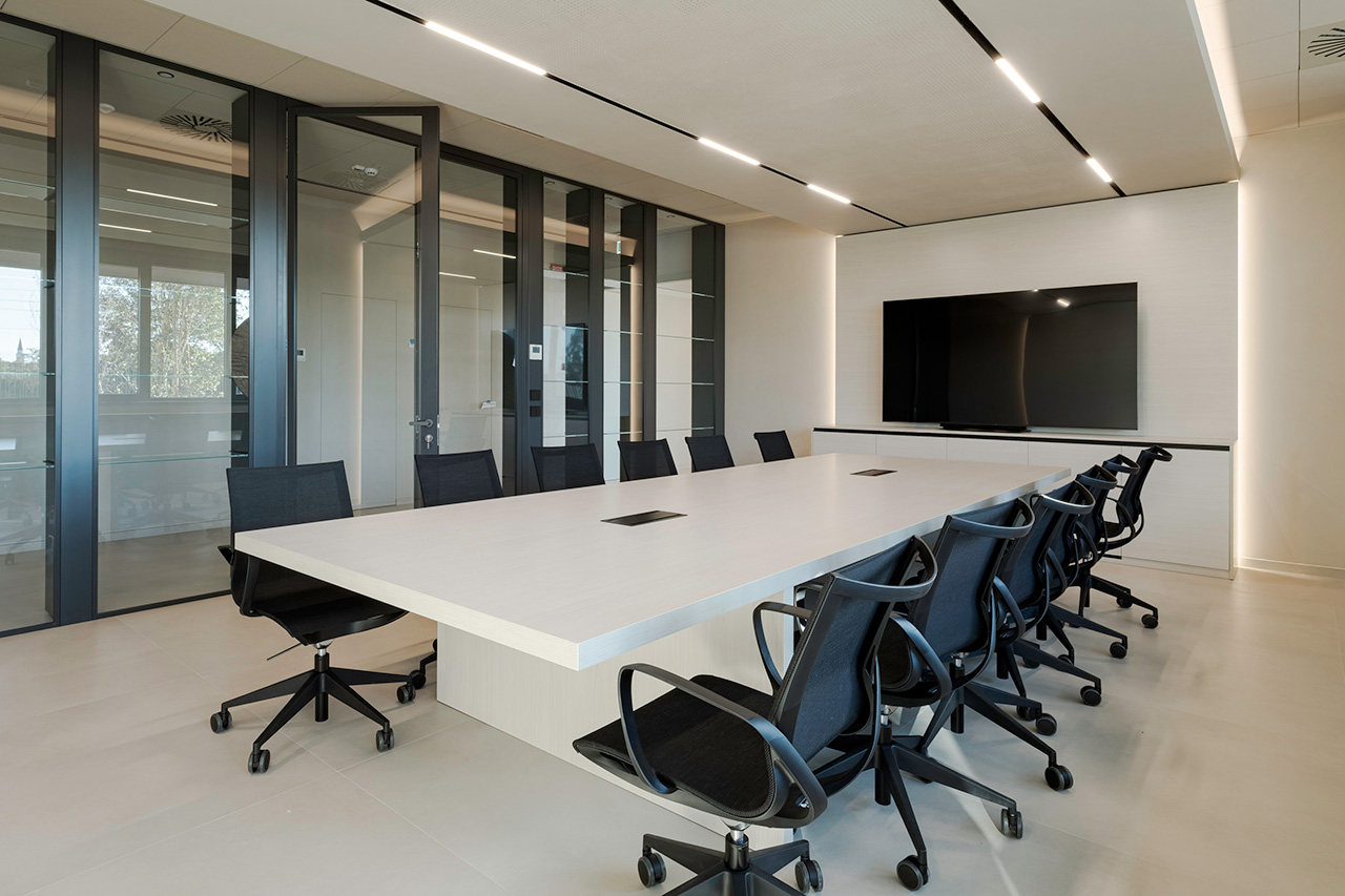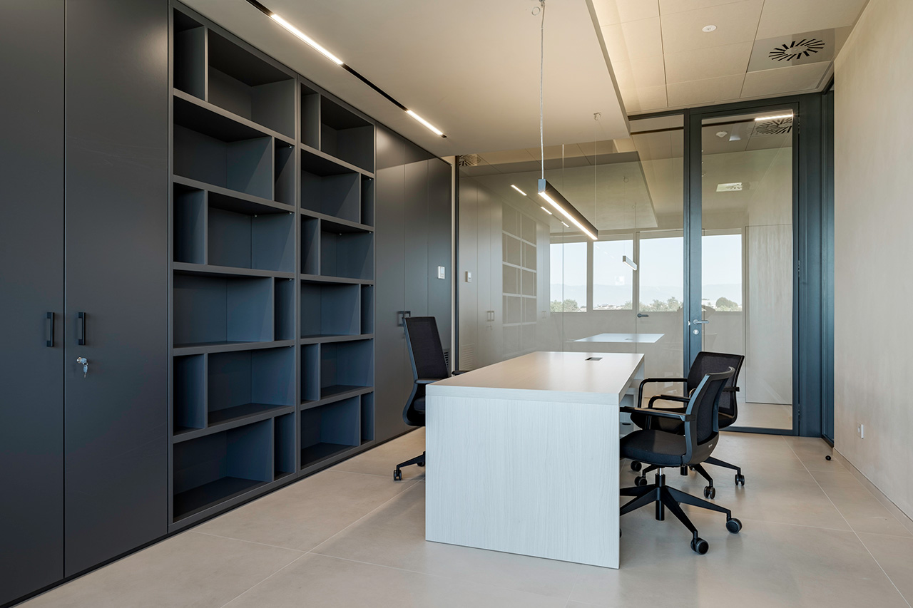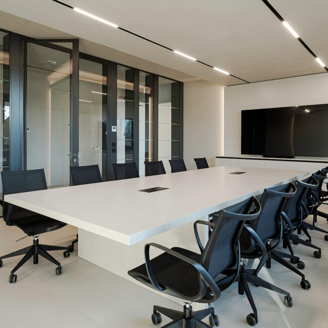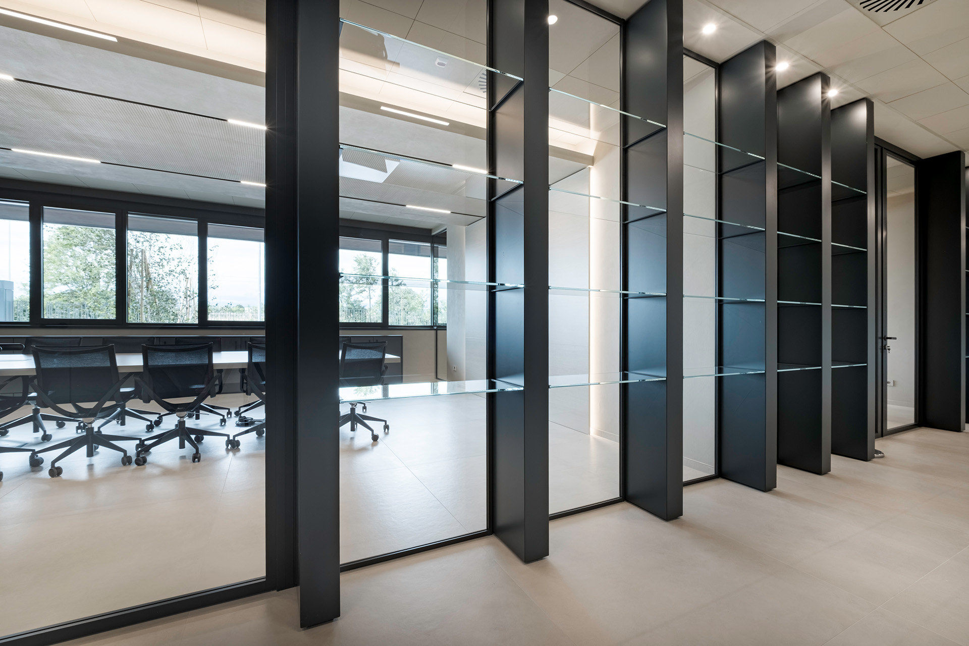 Le pareti divisorie organizzano lo spazio con precisione, accompagnando la luce e costruendo ambienti distinti ma connessi. Le superfici vetrate mantengono trasparenza e profondità, mentre le soluzioni adottate contribuiscono a un controllo acustico efficace, migliorando la qualità degli ambienti operativi.
