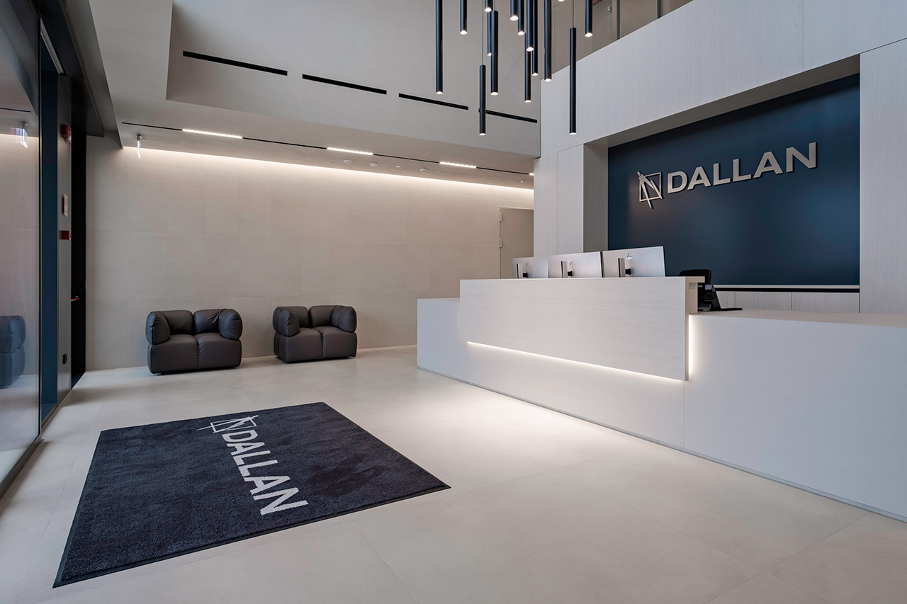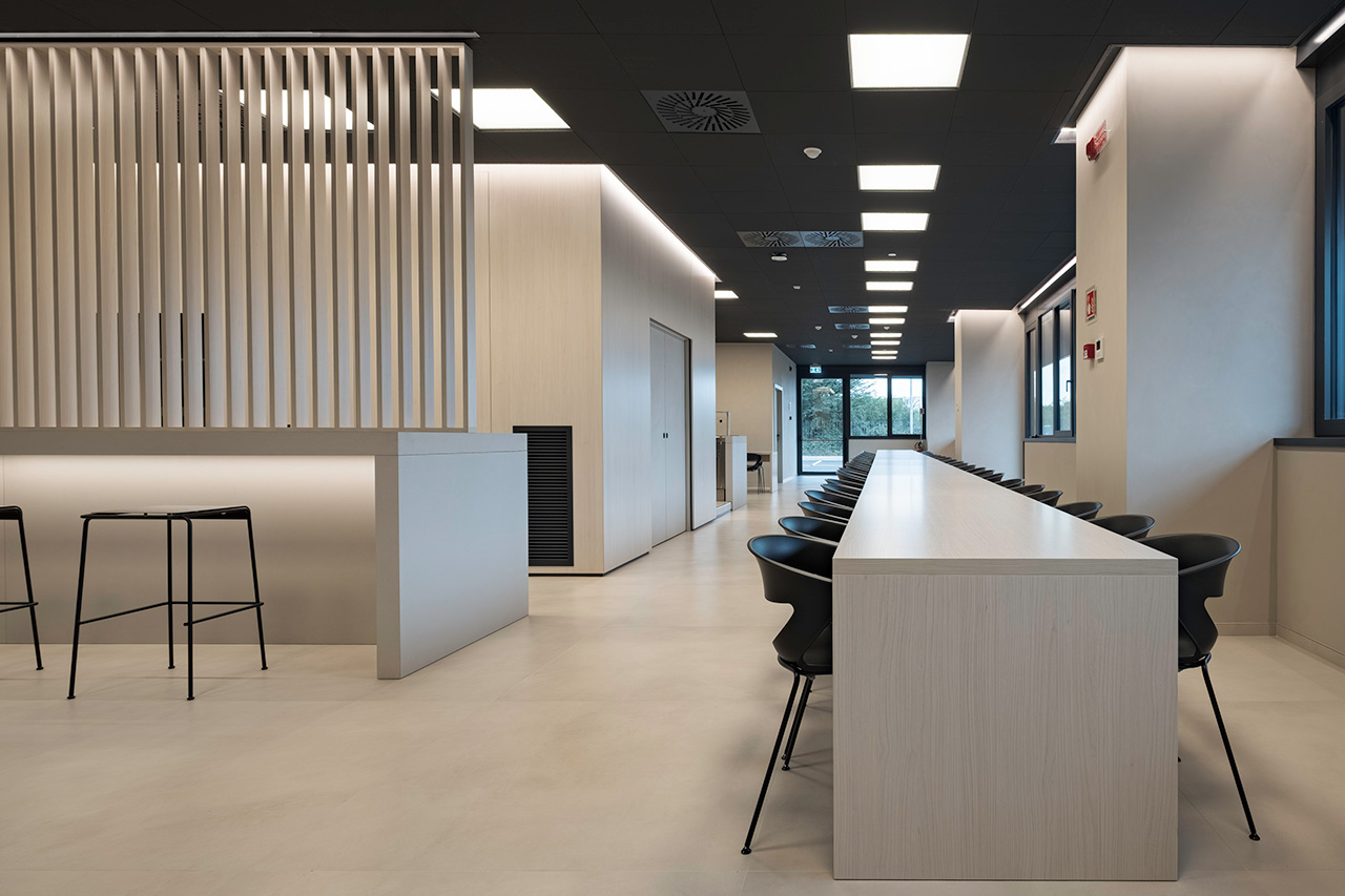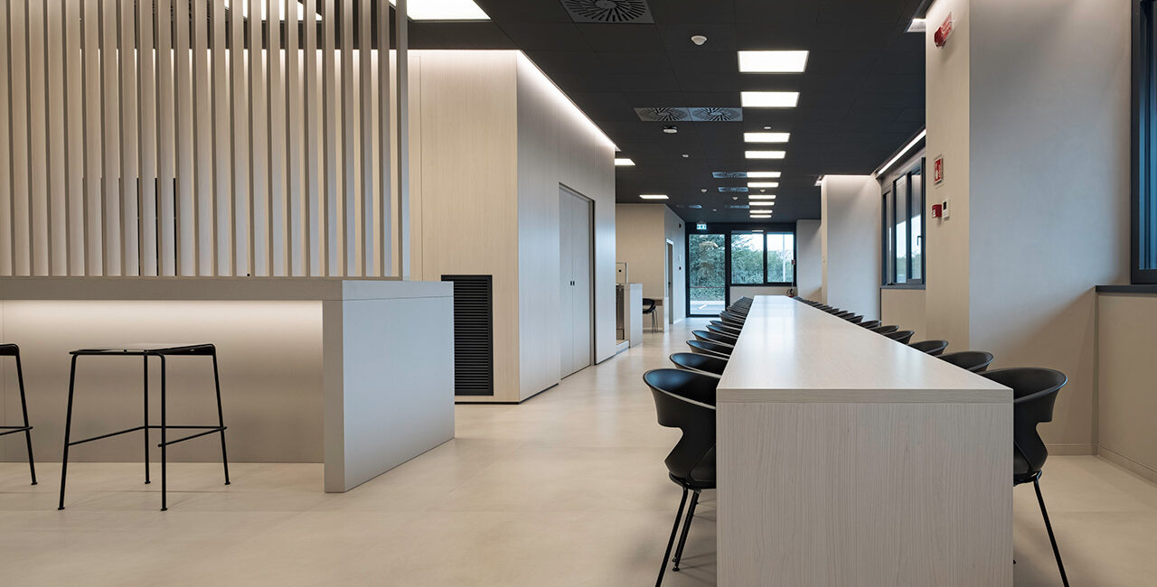 Continuità visiva, rigore formale ed equilibrio tra apertura e riservatezza definiscono gli uffici Dallan realizzati da Antonello Finiture, su progetto dell’Arch. Matteo Pauletto.