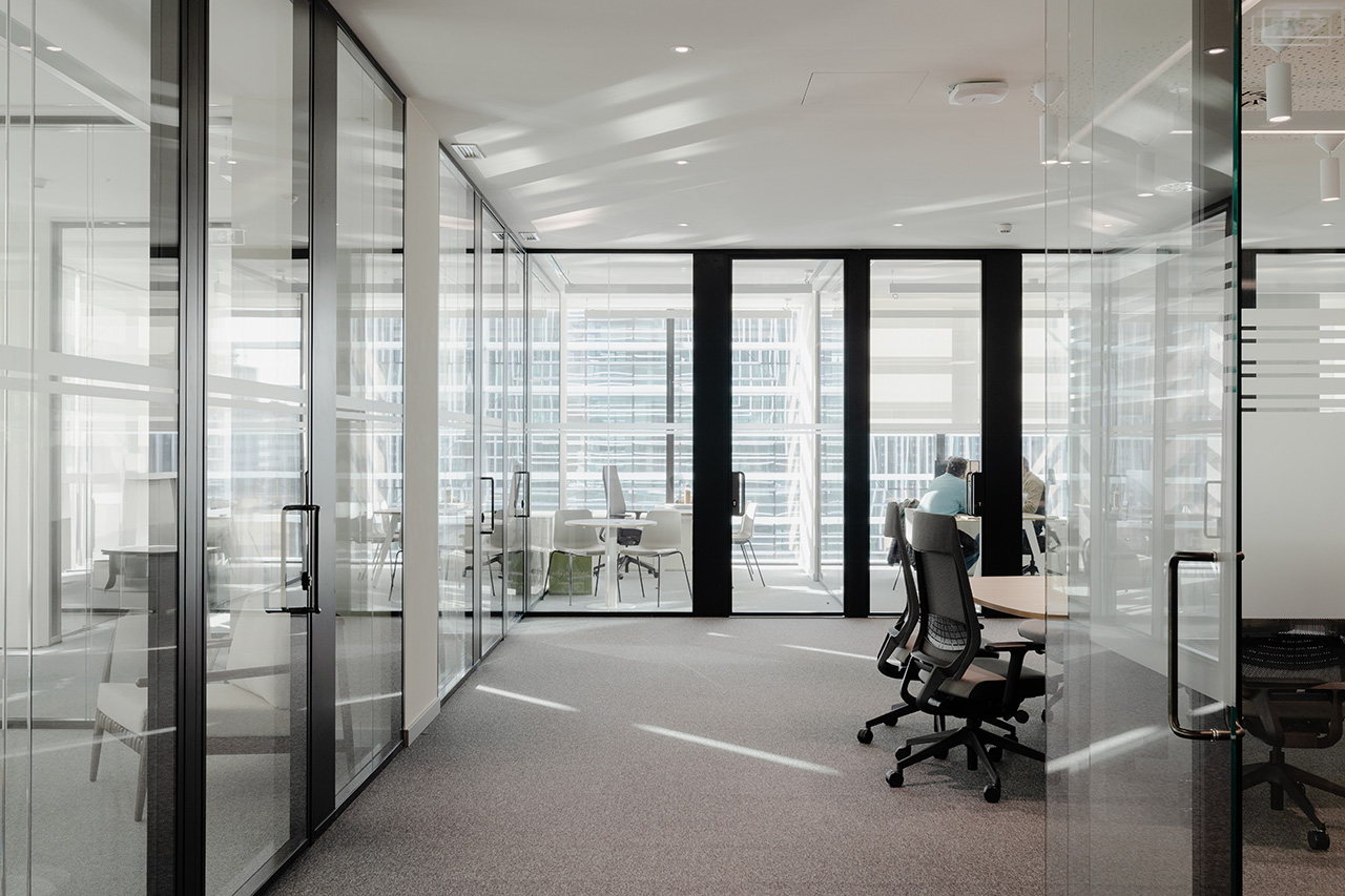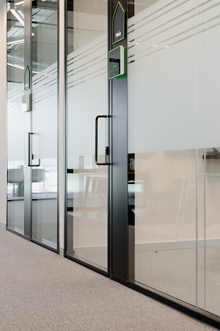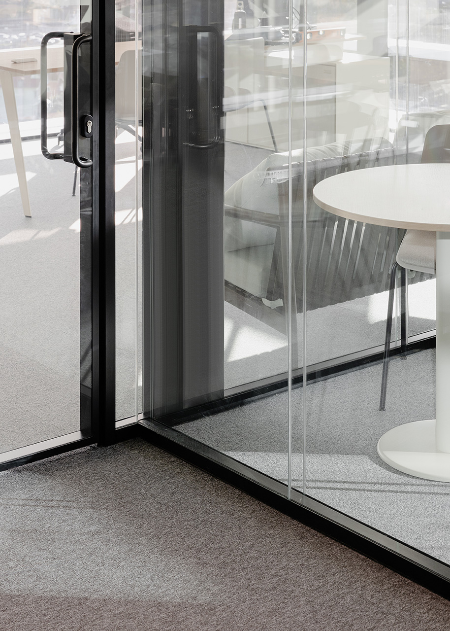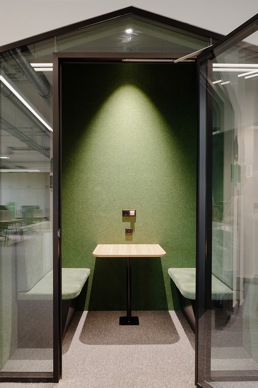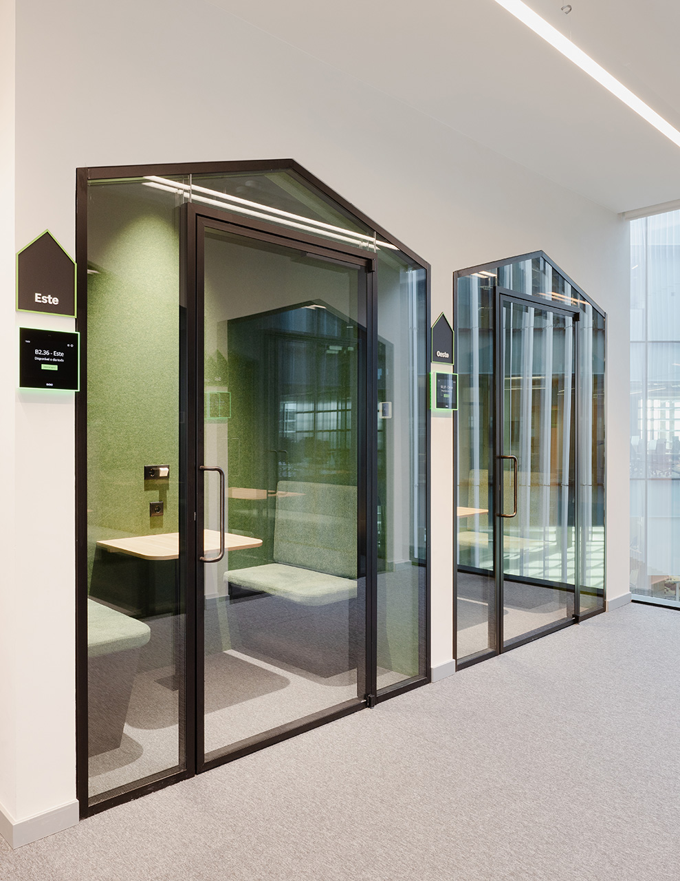 Sistemi vetrati, phone booths e soluzioni in PET dialogano tra loro per costruire un ambiente di lavoro contemporaneo, aperto ma controllato.