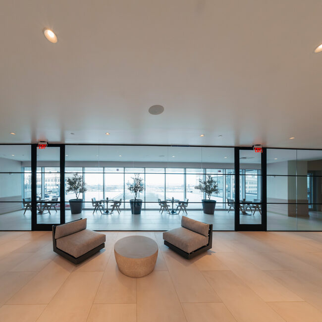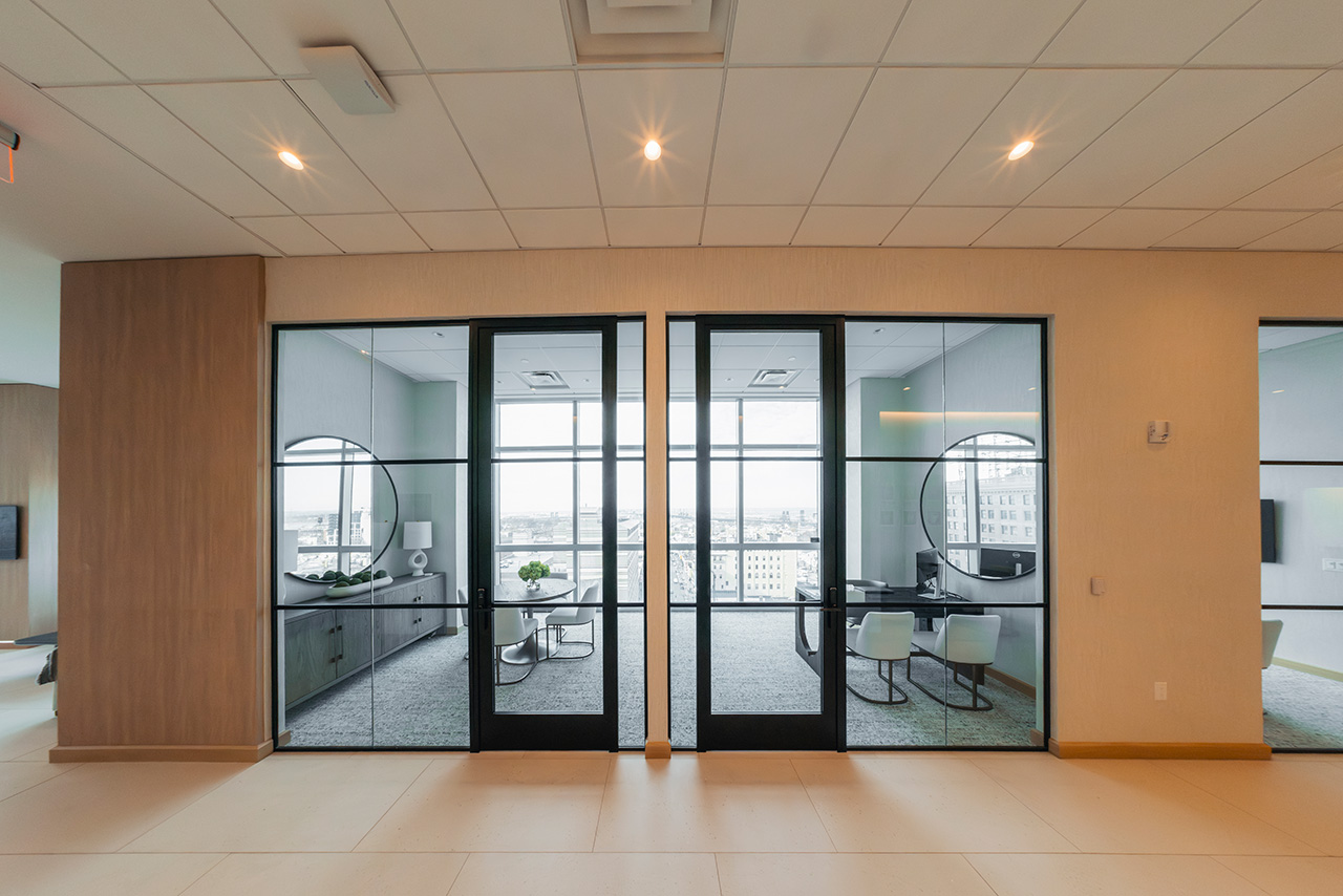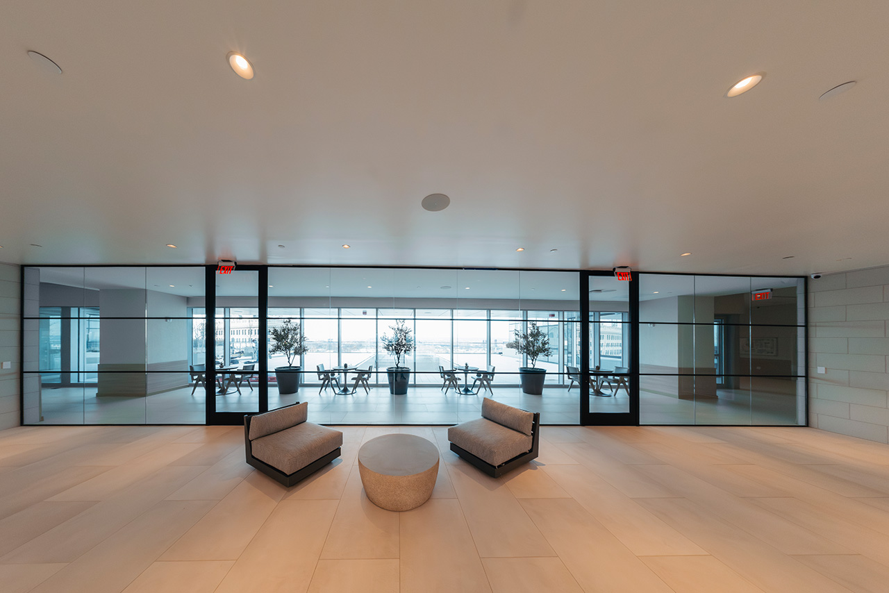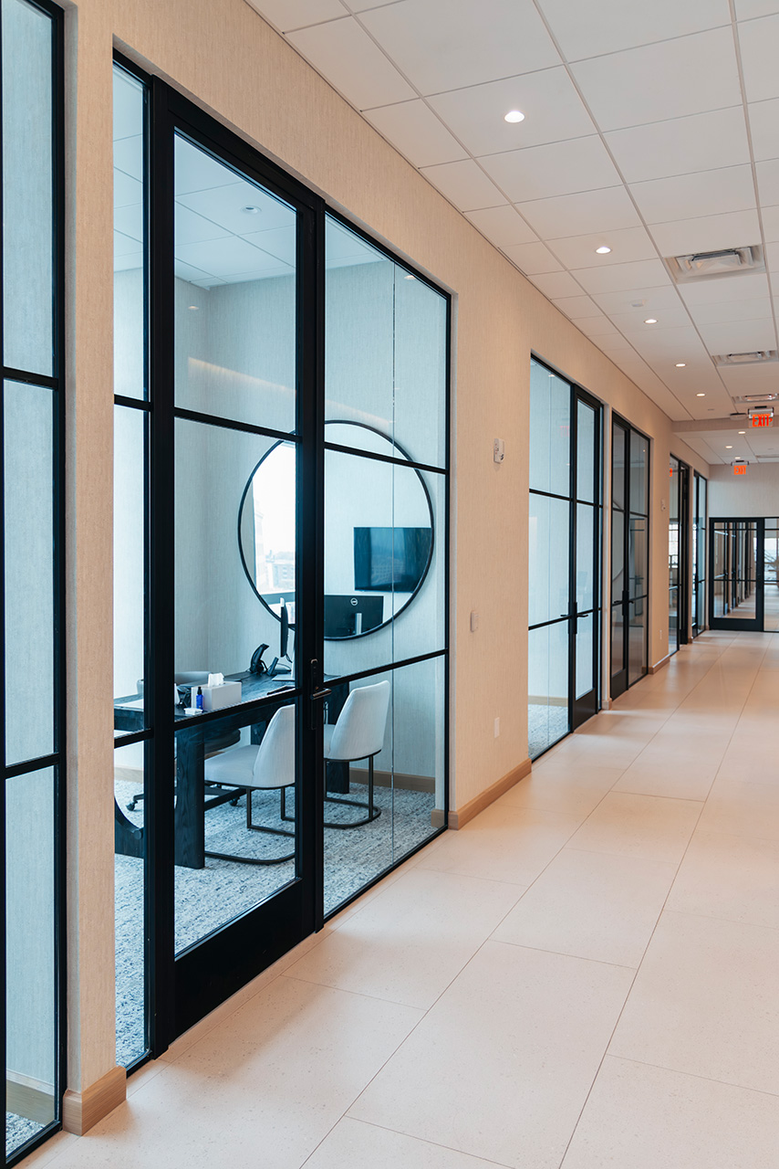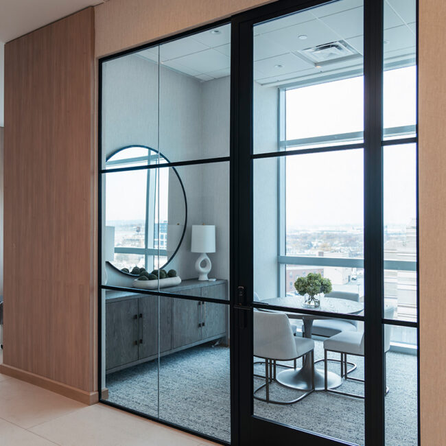 Grandi aperture e integrazioni tecniche prendono forma attraverso pareti divisorie progettate su misura, capaci di adattarsi a funzioni e scale diverse senza rinunciare a pulizia formale e proporzione.