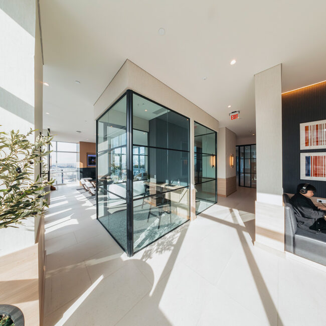 Il risultato è uno spazio condiviso ordinato e luminoso, dove la luce diventa struttura e ogni elemento contribuisce a continuità visiva e precisione.