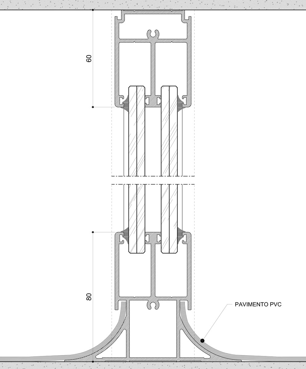 PROPOSTA: Creazione di profilo in alluminio avente funzione di binario a terra per parete vetrata Unica D con base curva per raccordare il rivestimento del pavimento in PVC.